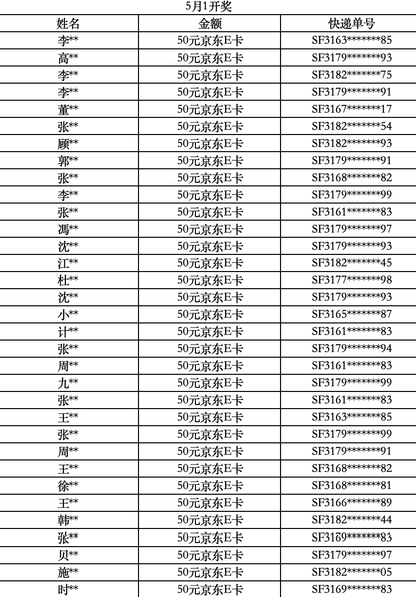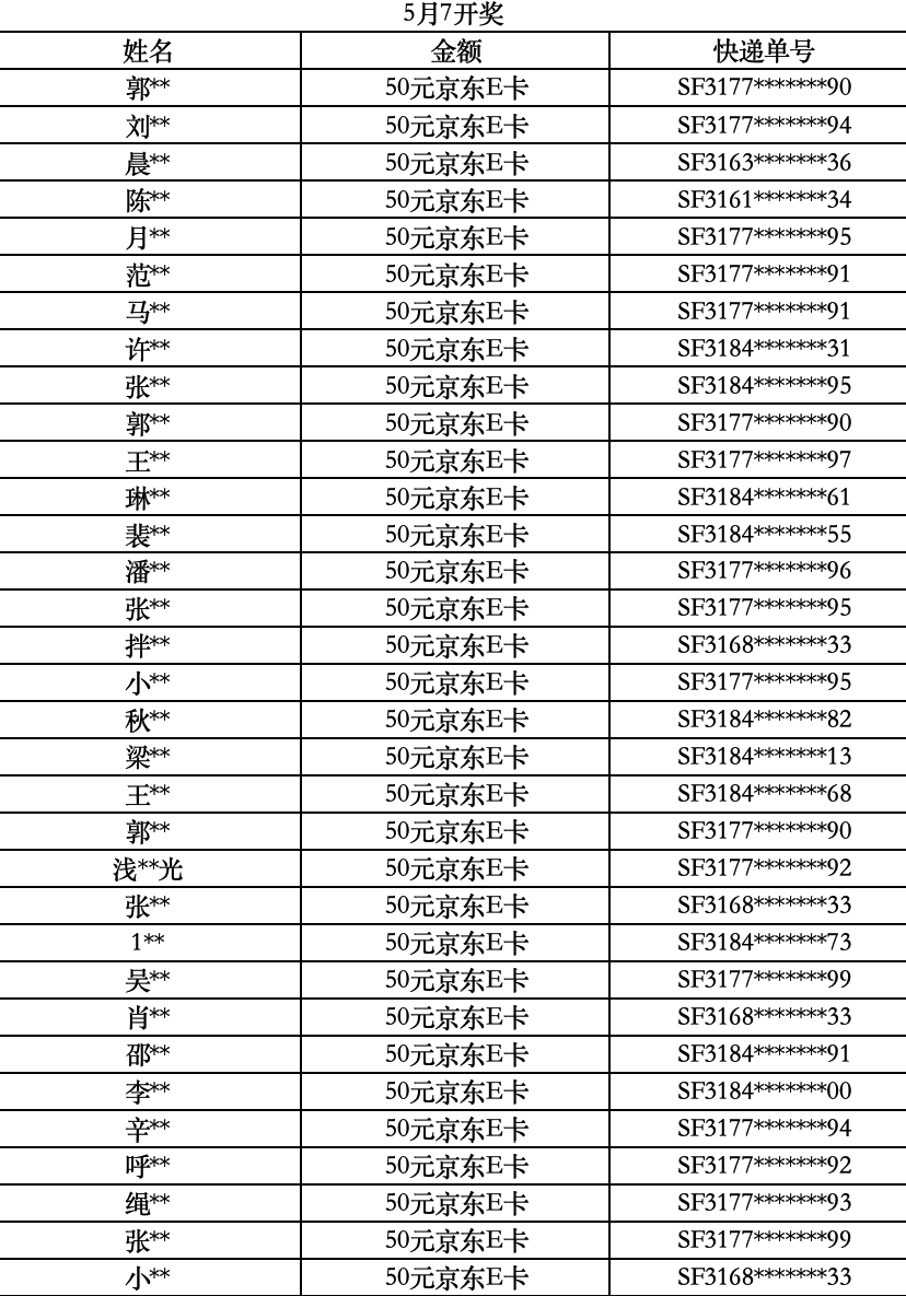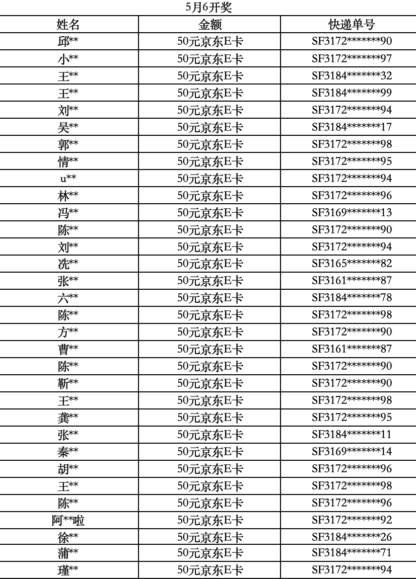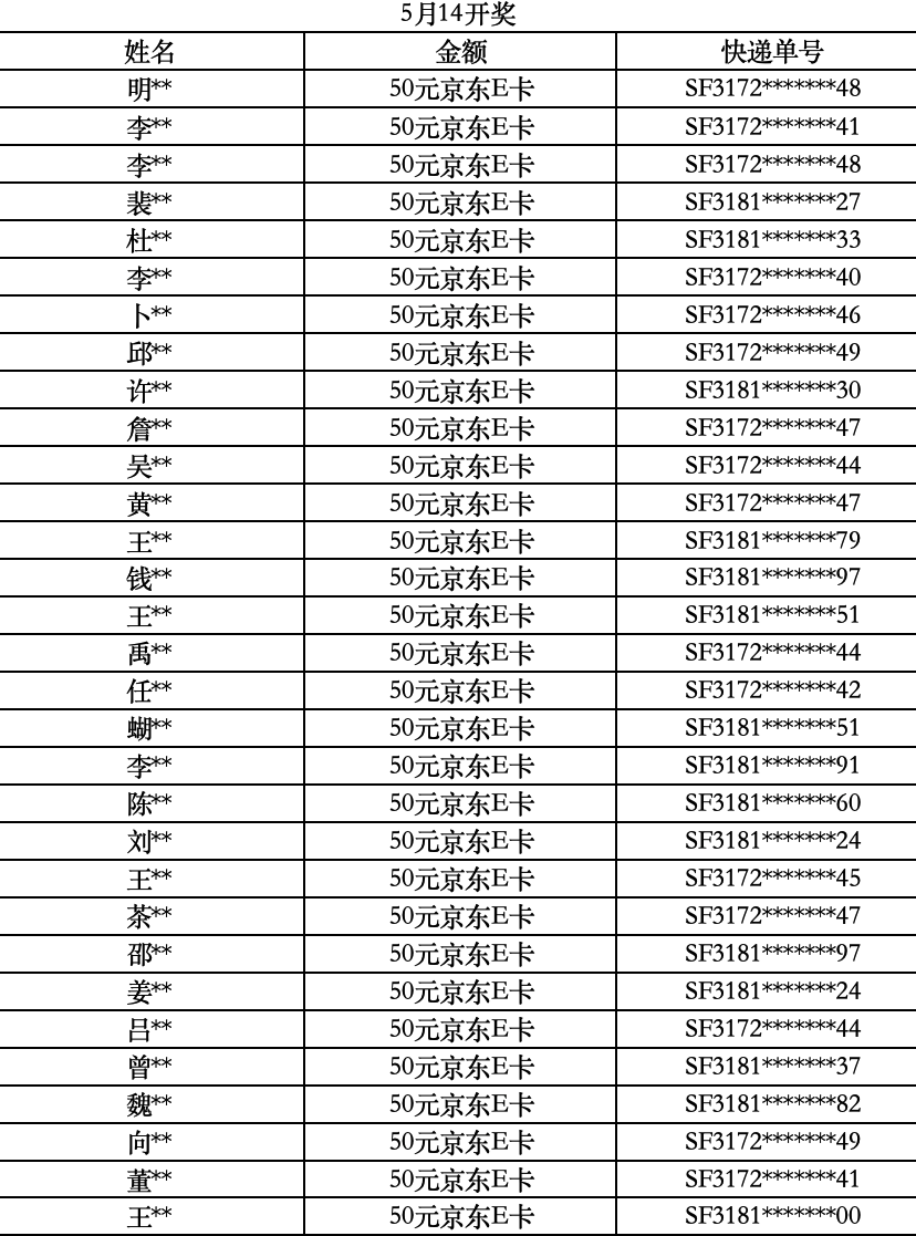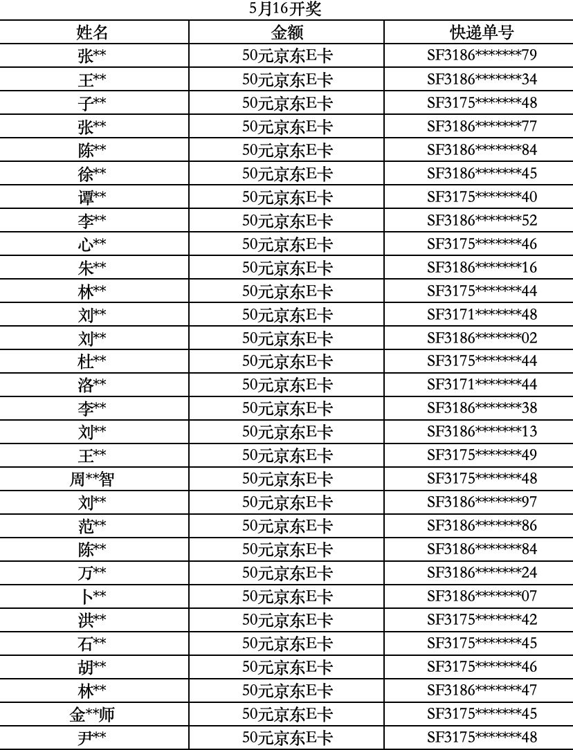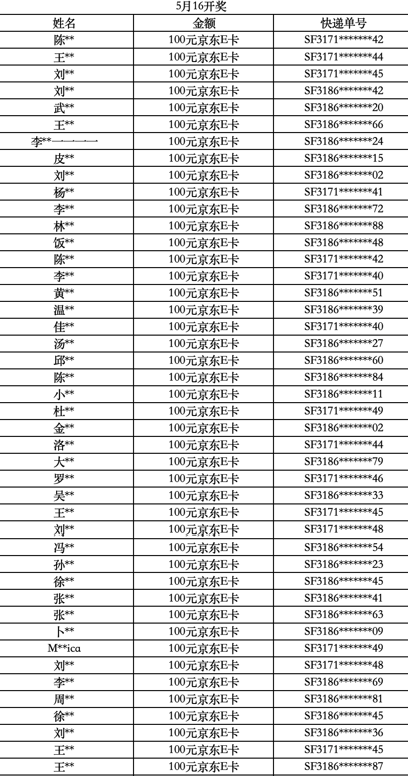 以下是2025年5月1日至5月16日开奖的【已填写地址,已发货】的中奖名单: