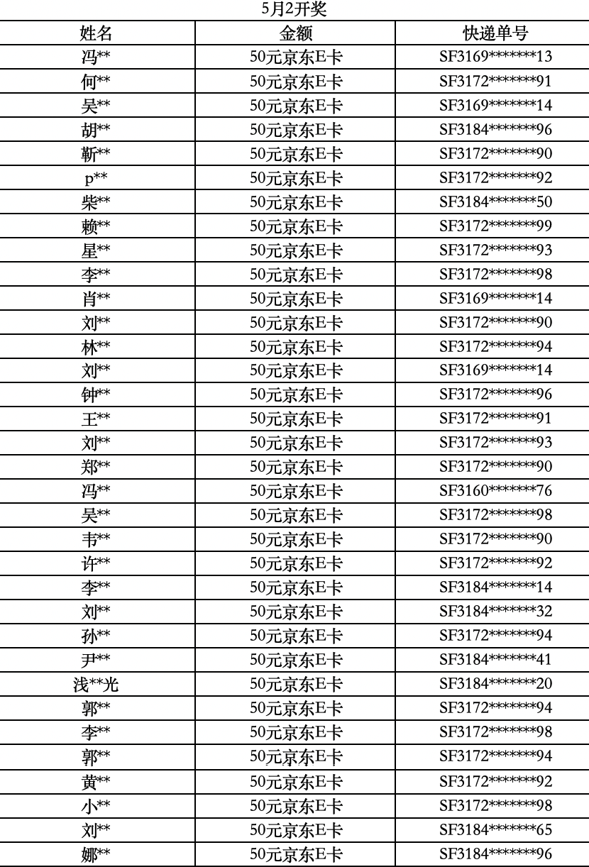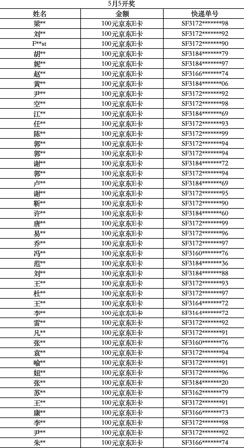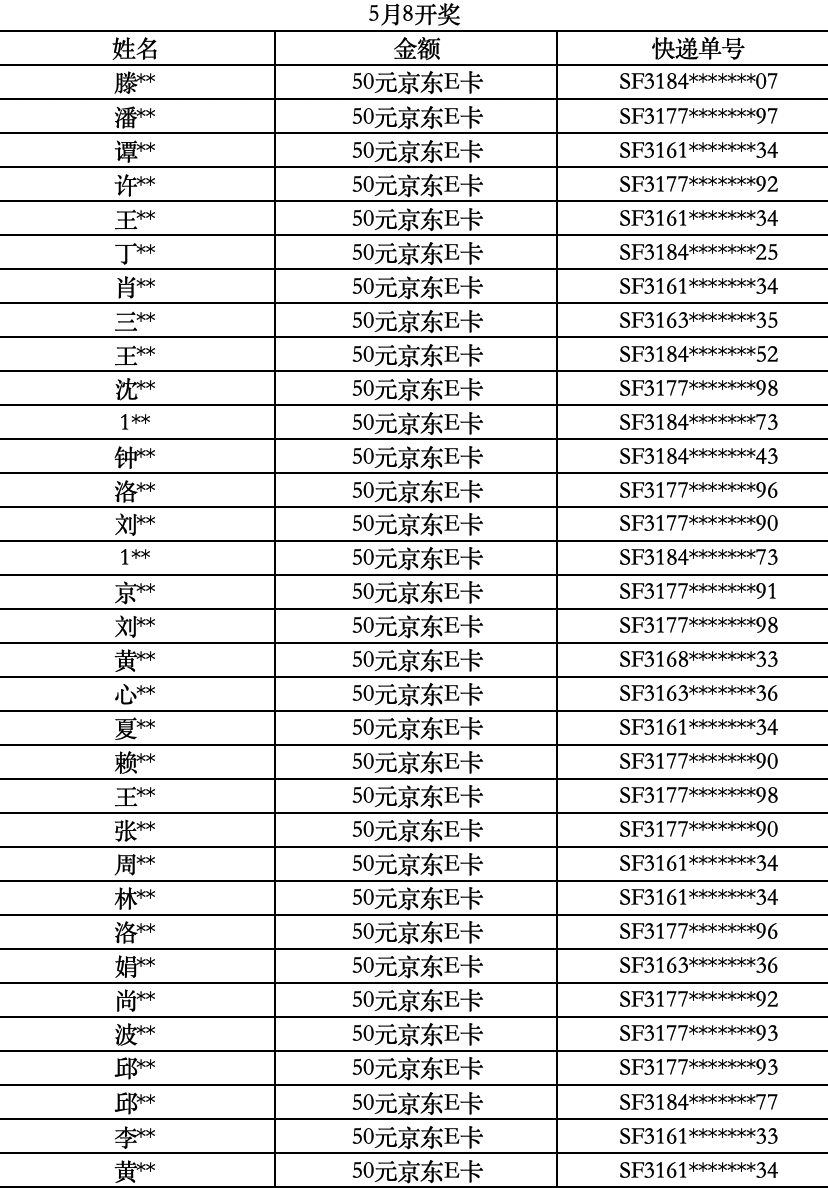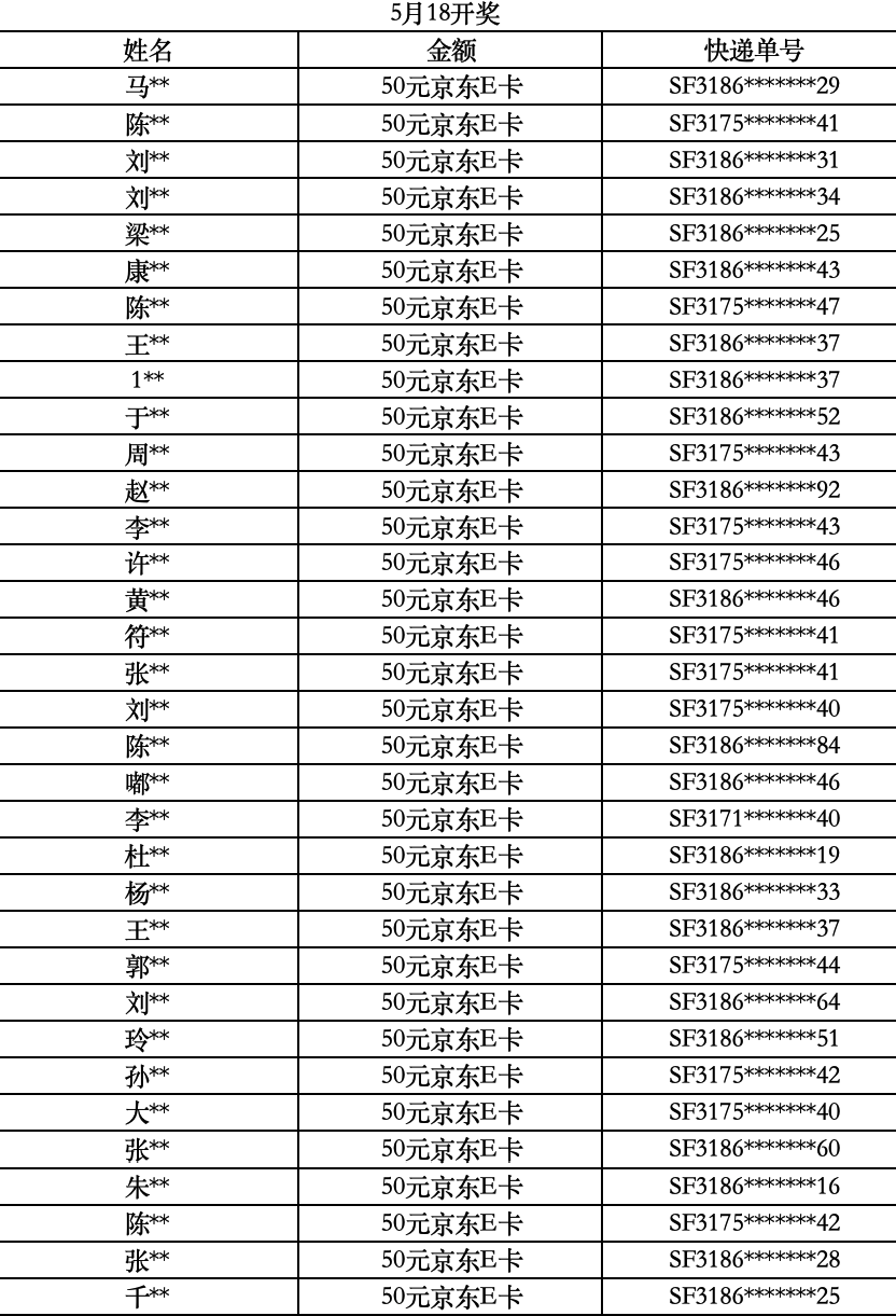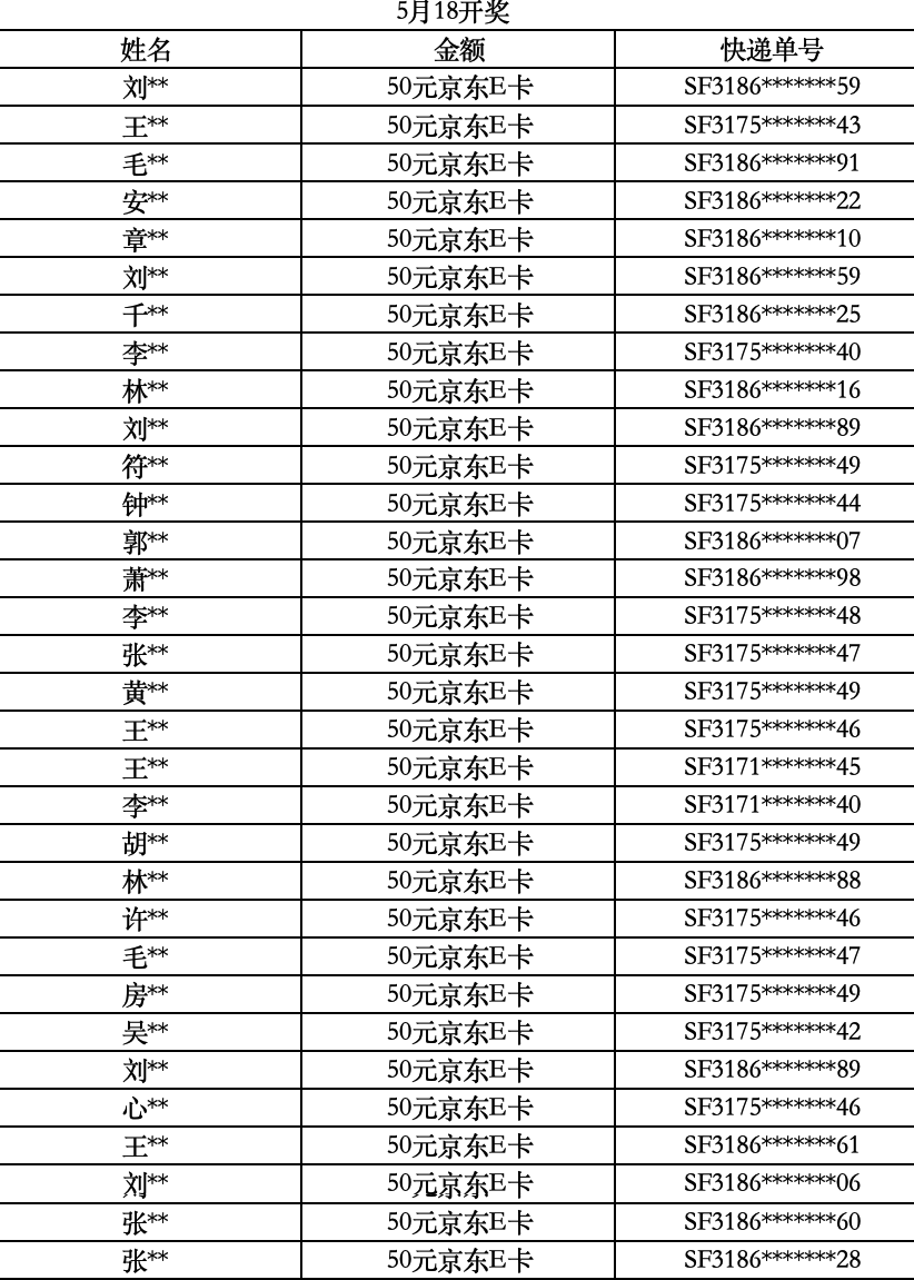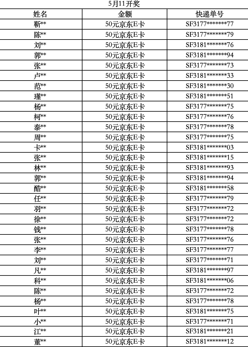 以下是2025年5月1日至5月16日开奖的【已填写地址,已发货】的中奖名单: