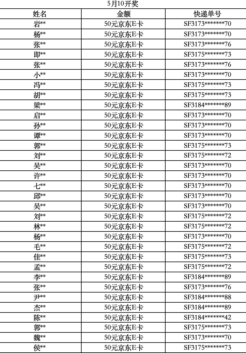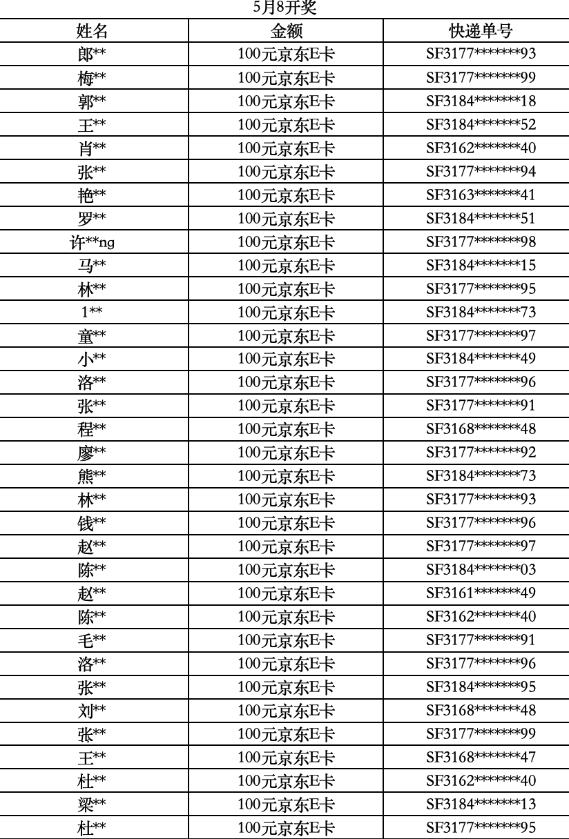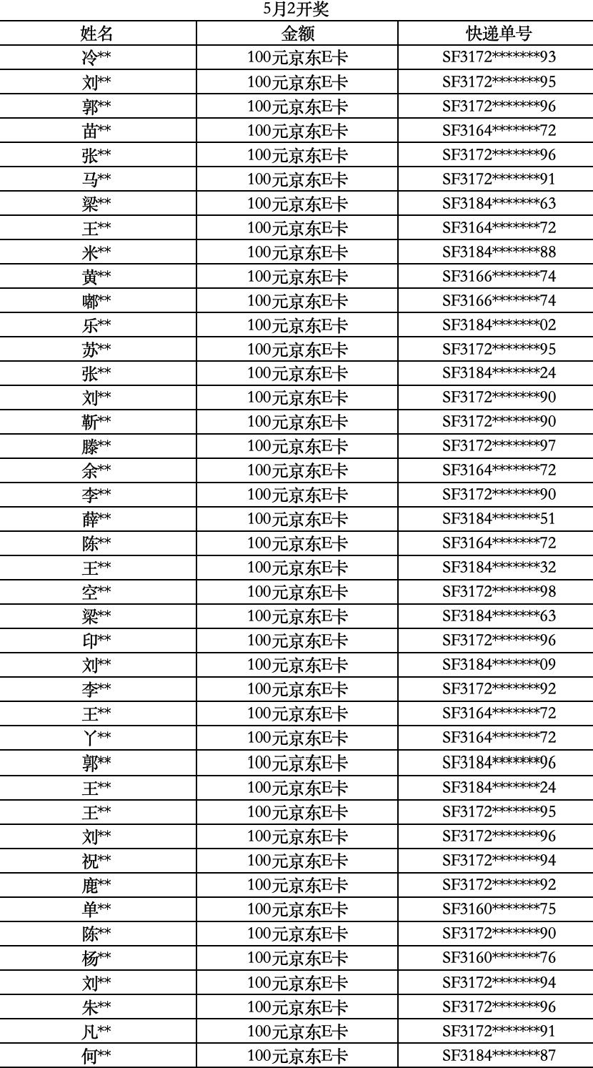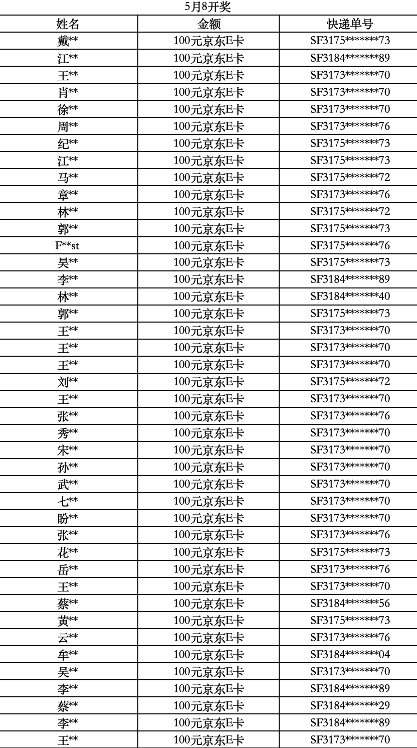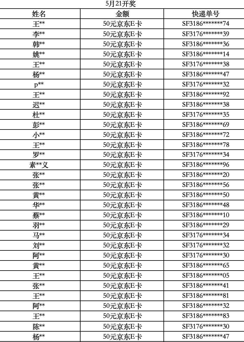 以下是2025年5月1日至5月16日开奖的【已填写地址,已发货】的中奖名单: