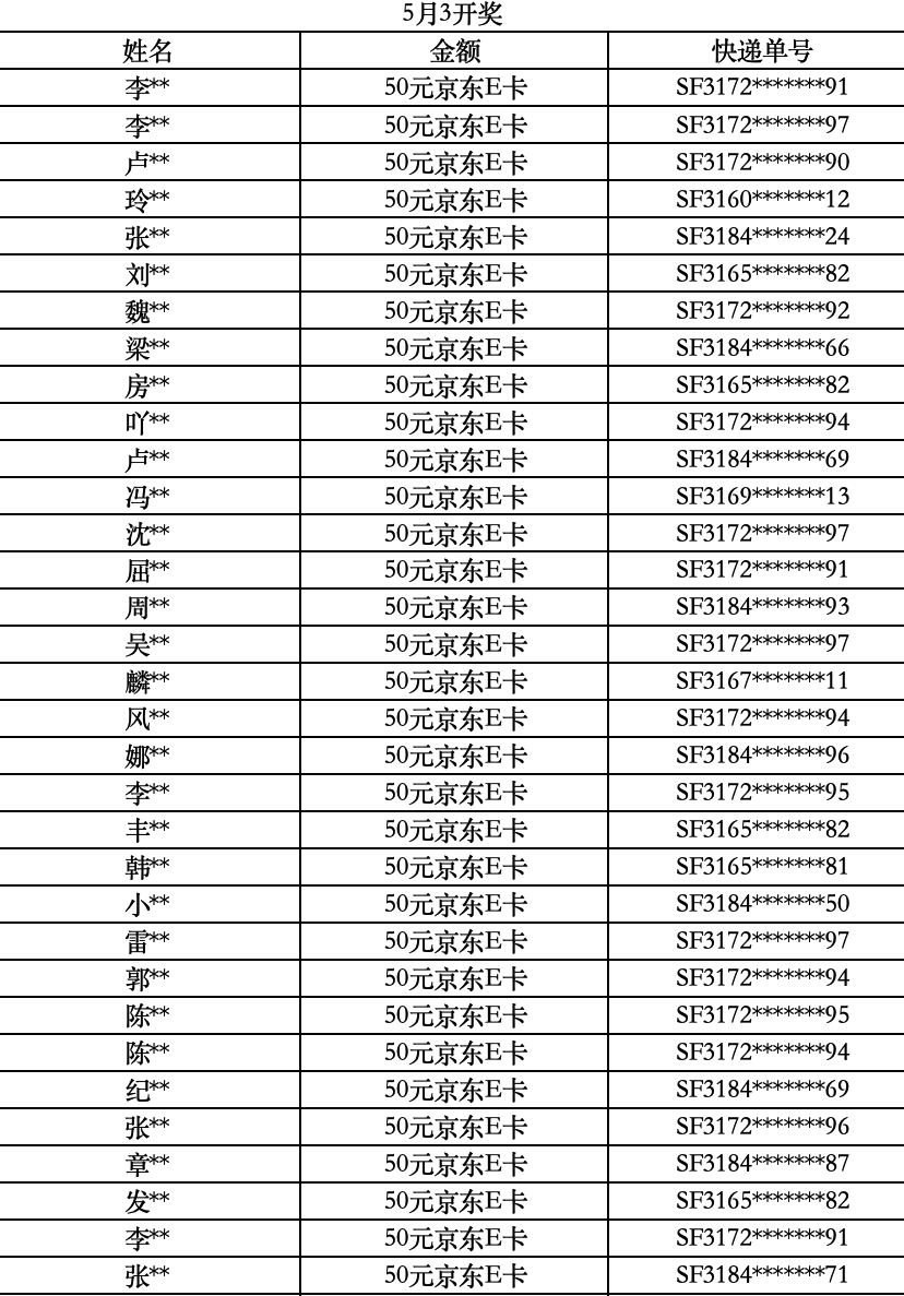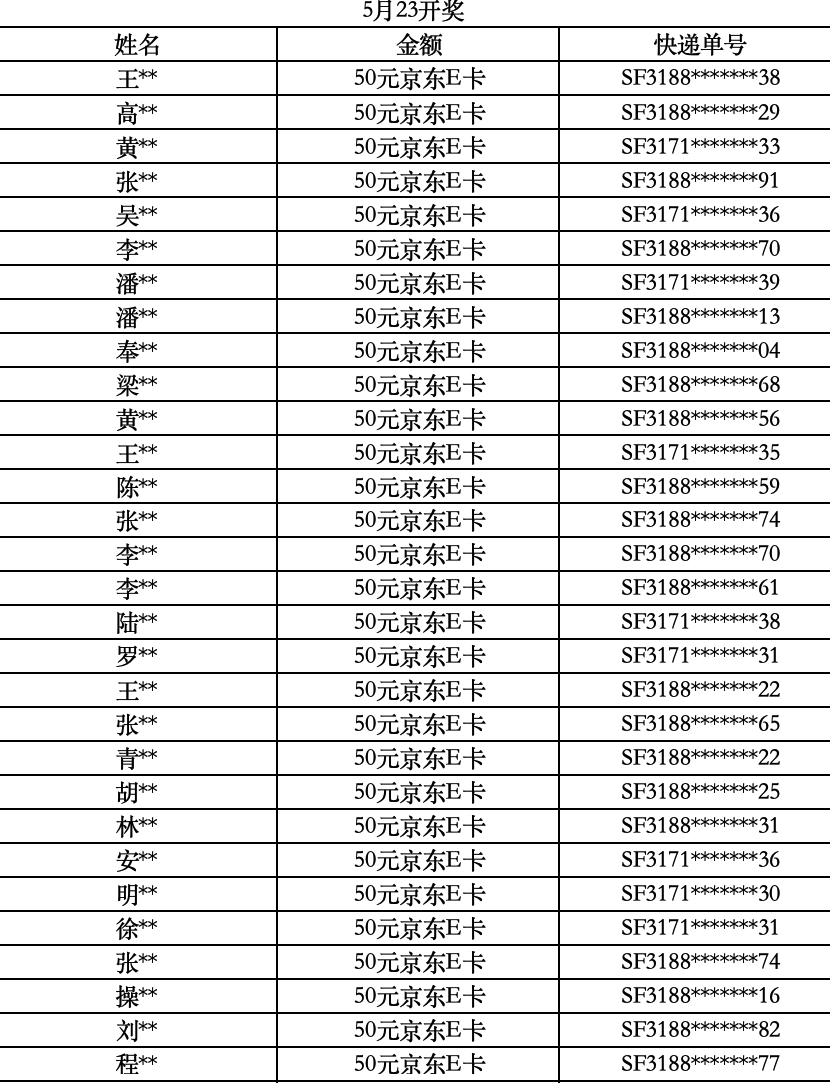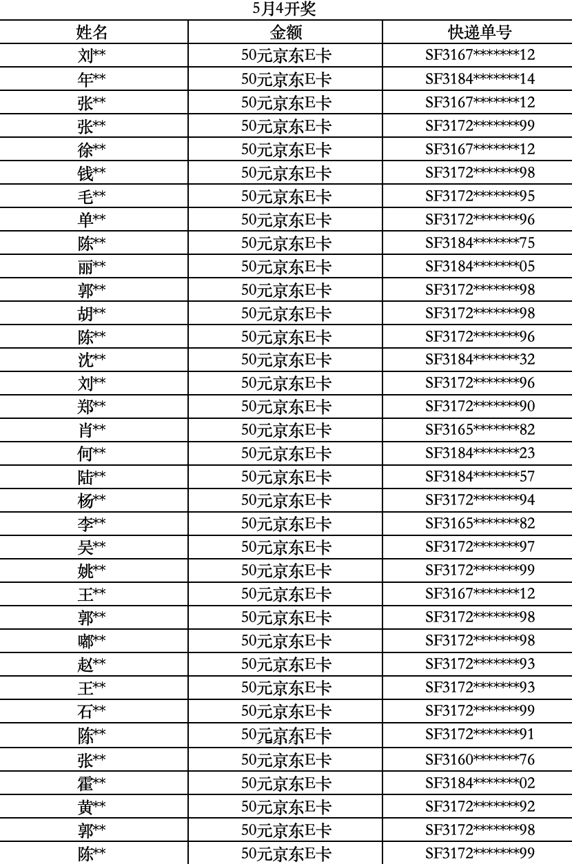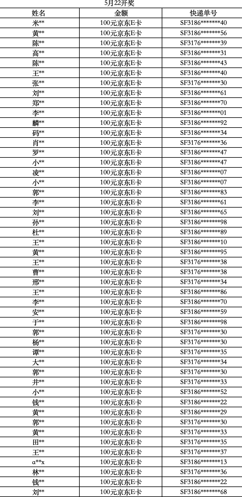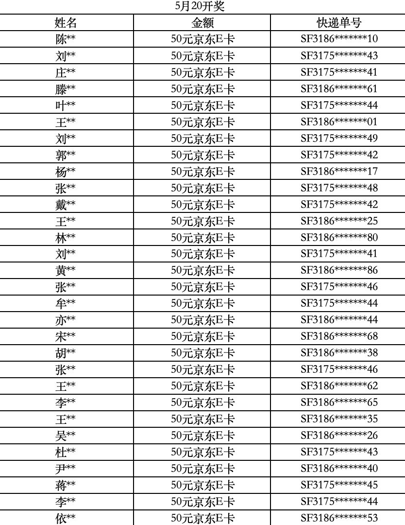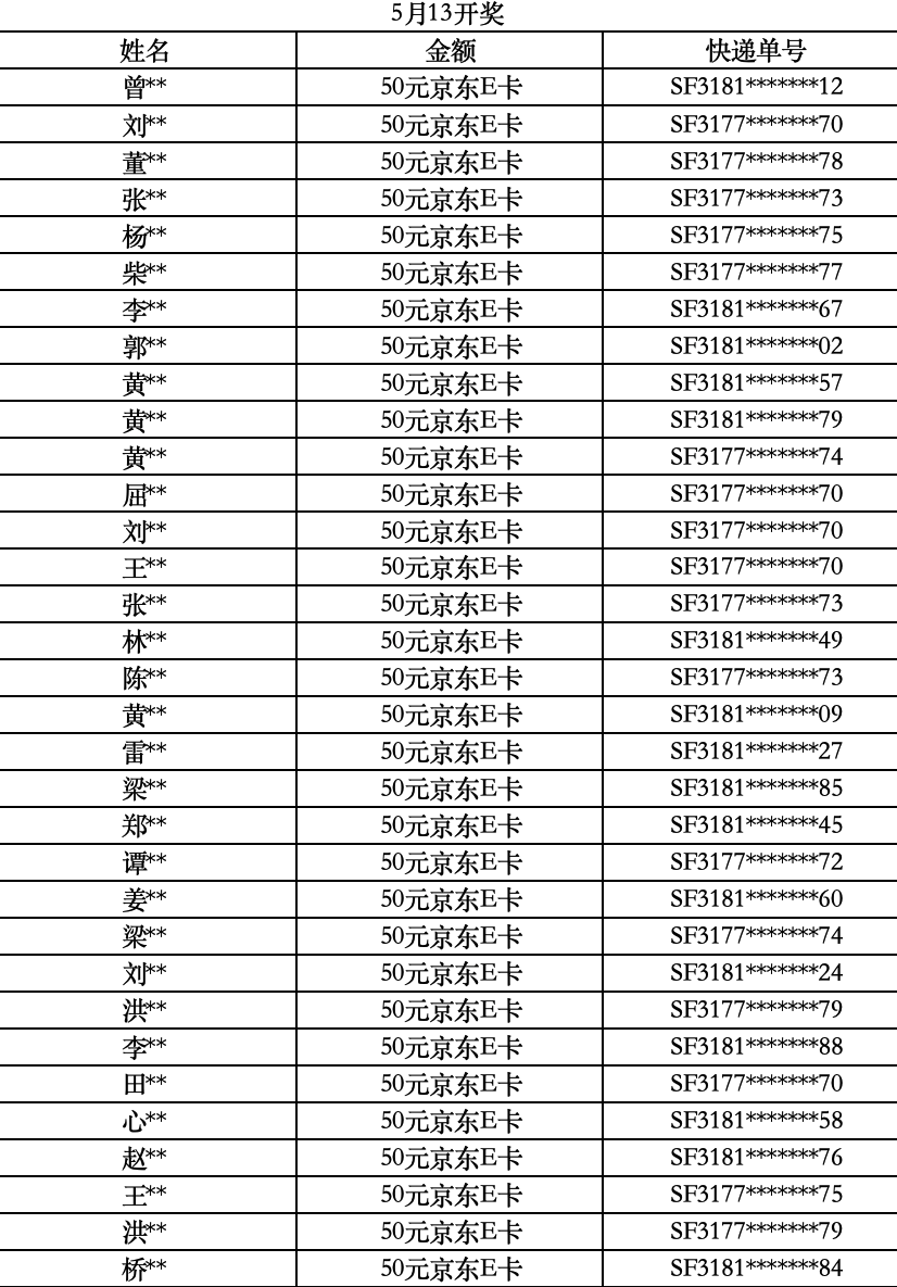 以下是2025年5月1日至5月16日开奖的【已填写地址,已发货】的中奖名单: