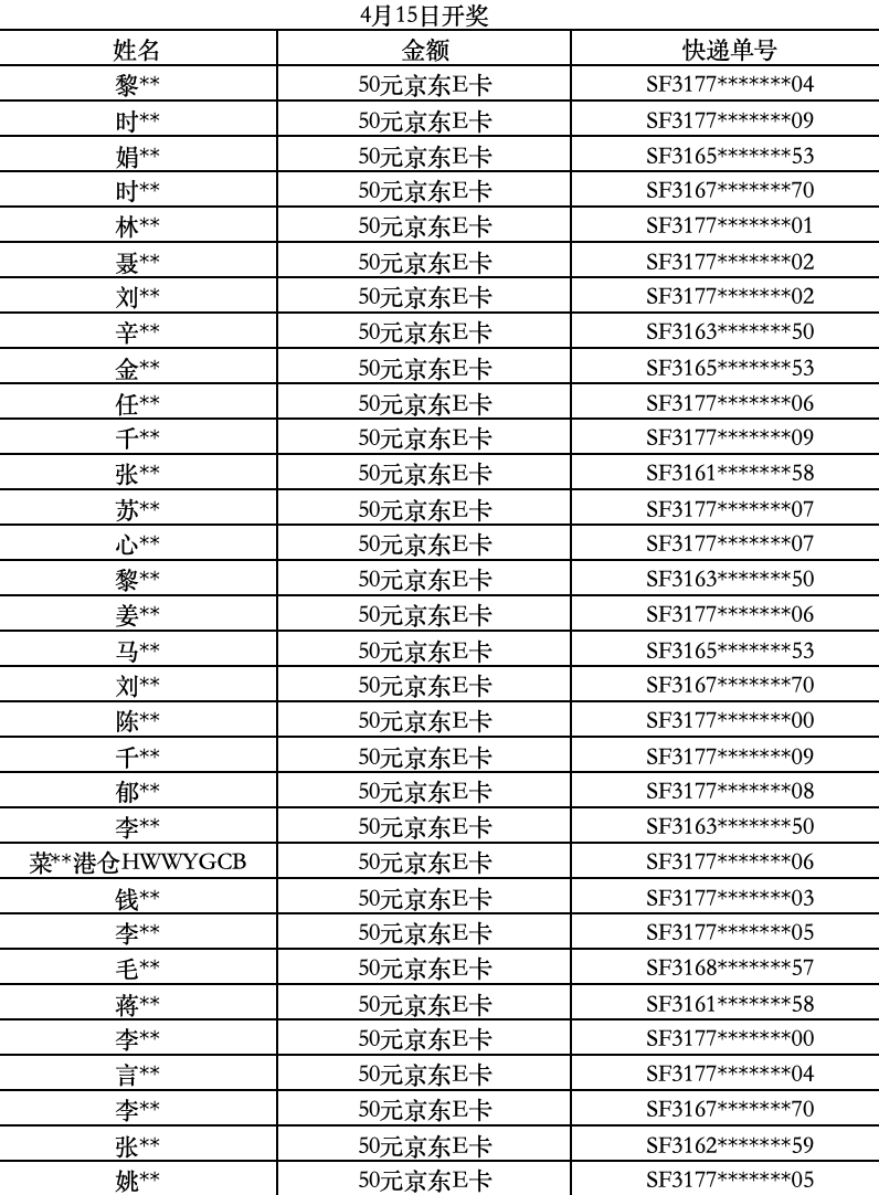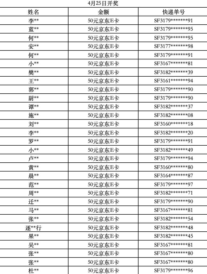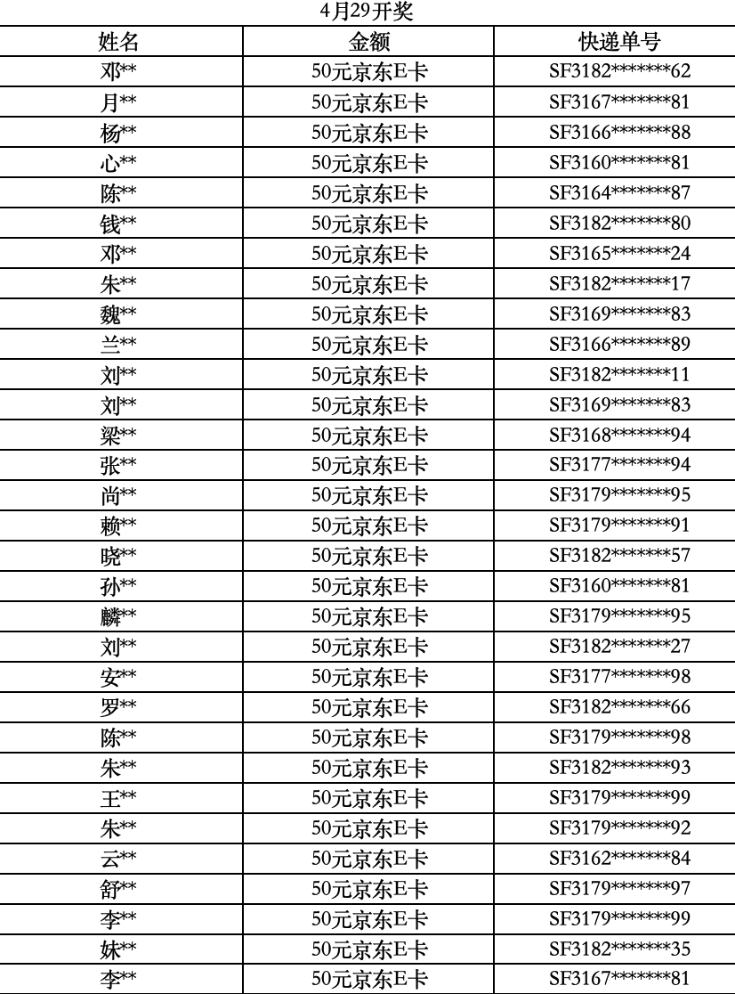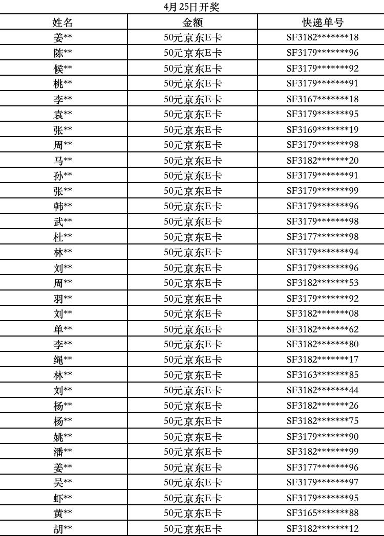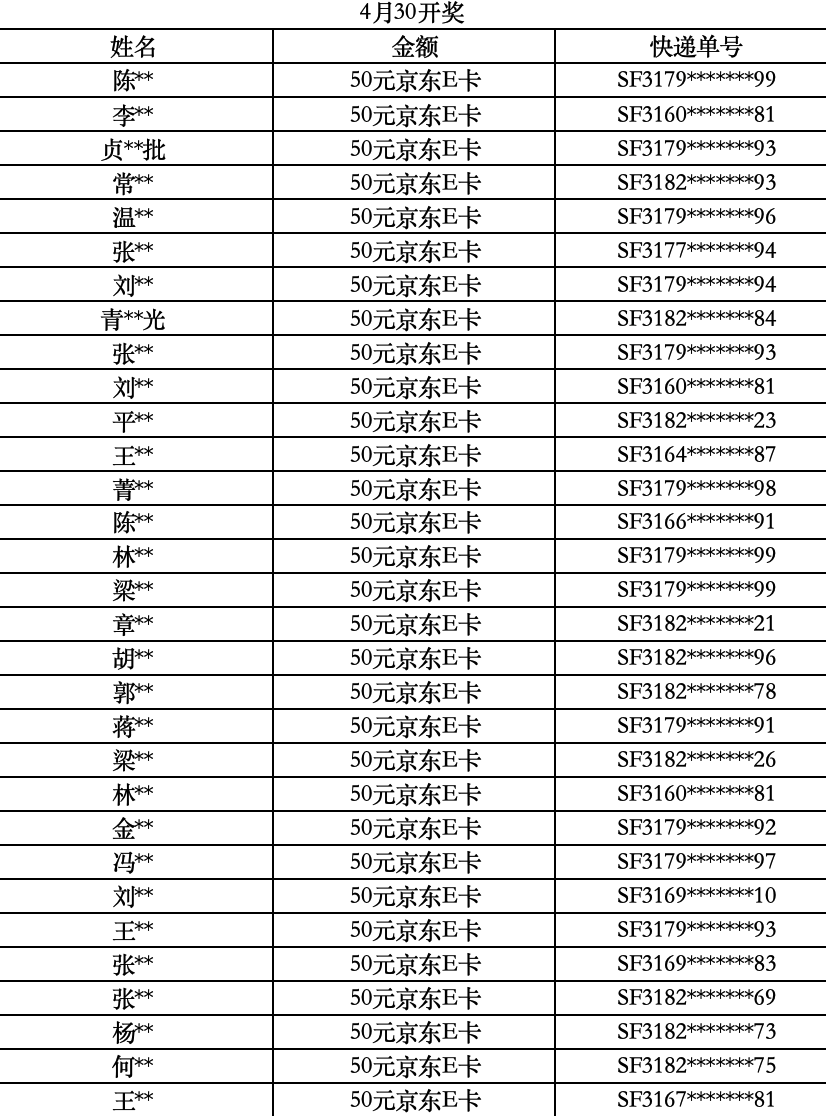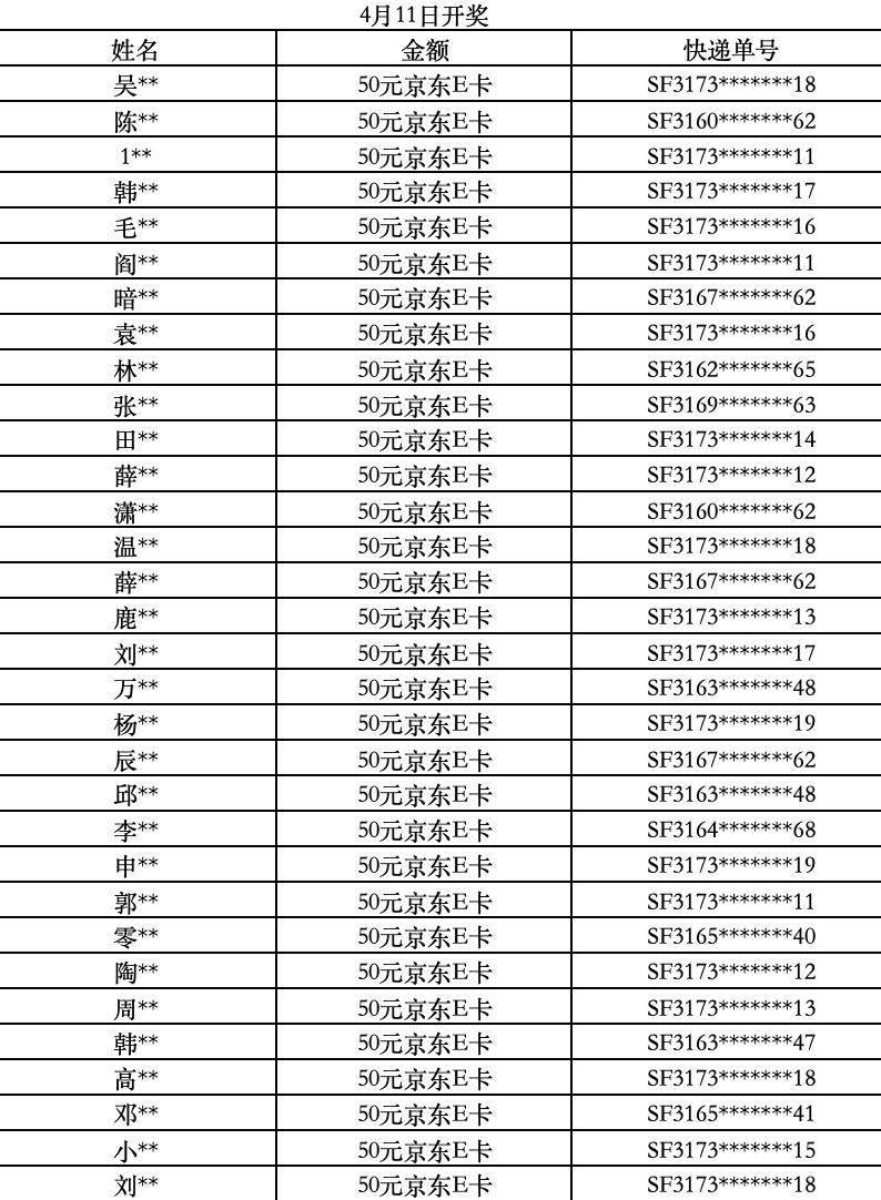以下是是2025年4月1日至4月30日开奖的【已填写地址,已发货】的中奖名单: