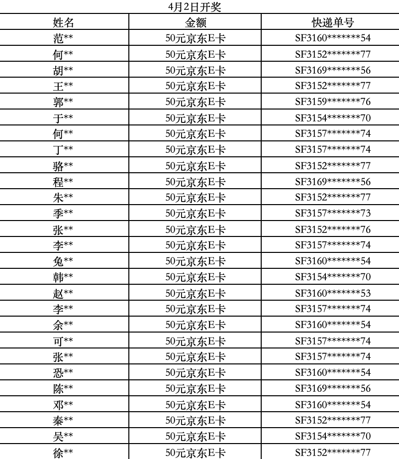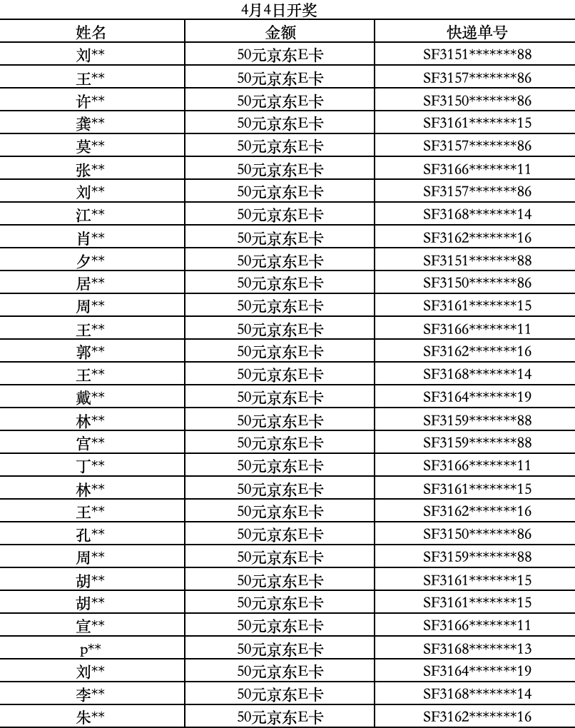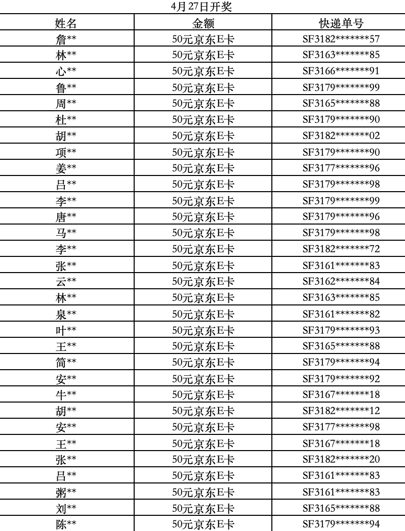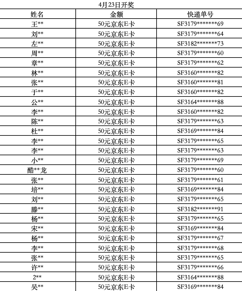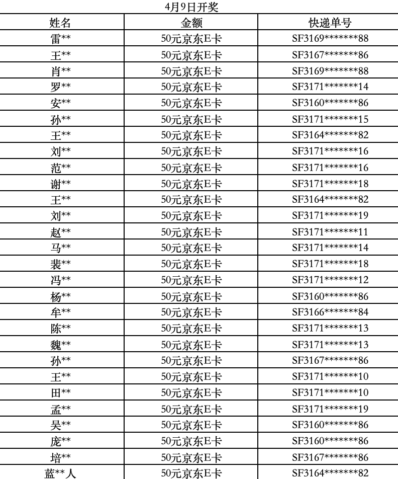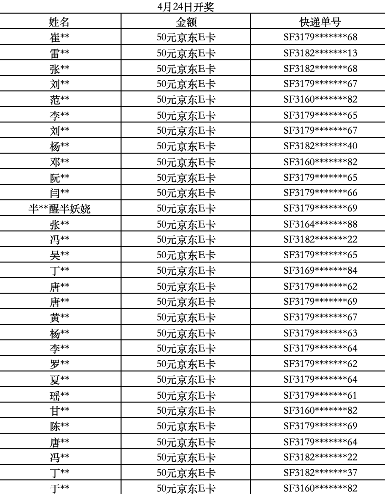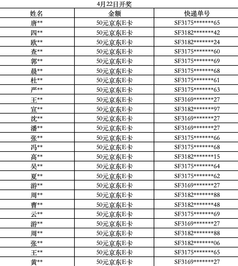 以下是是2025年4月1日至4月30日开奖的【已填写地址,已发货】的中奖名单: