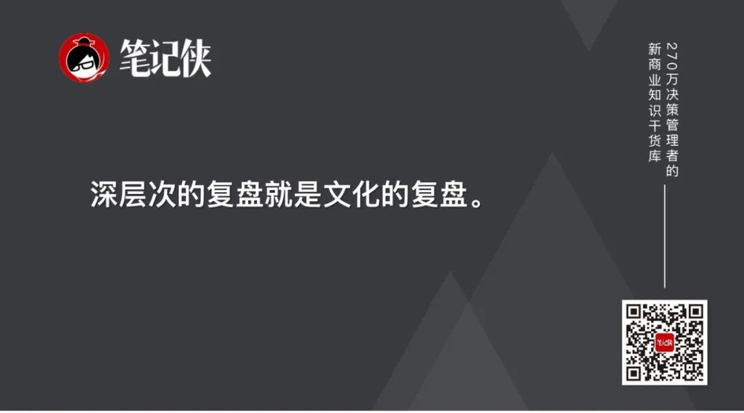 深层次的复盘就是文化的复盘。虽然复盘是从各个部门的业务入手,最后流向却归位于企业文化的反思。