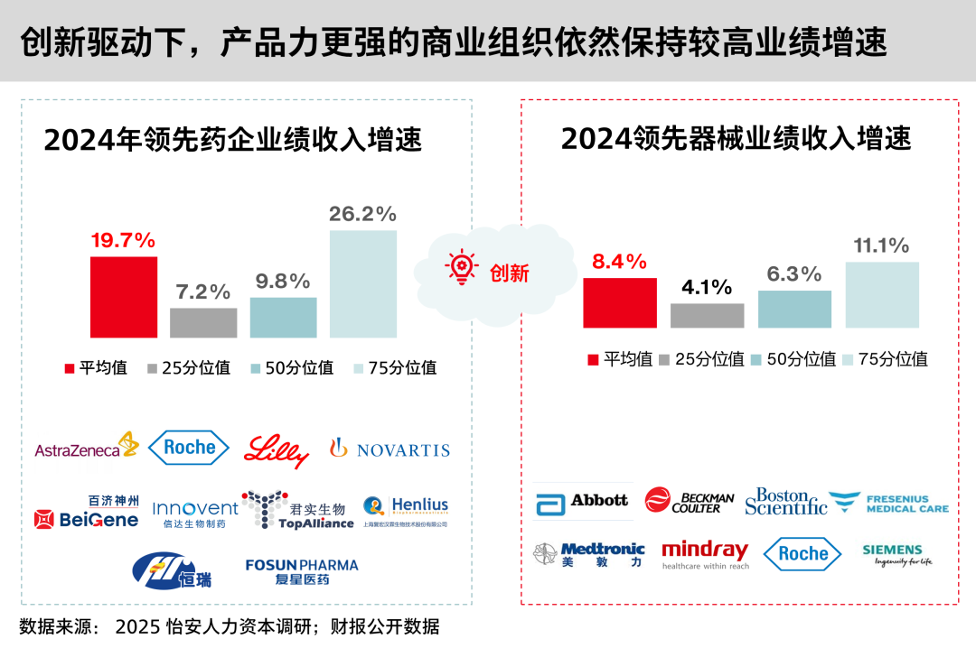 尽管市场观点各异,外资与内资医药企业的整体营收仍保持基本稳定,展现出成熟商业模式的韧性。与此同时,行业内的并购整合持续活跃,多数呈现出防御性收缩特征。值得注意的是,内资企业之间的两极分化趋势愈发明显,2024年内资企业营收增长率的25分位值已降至-11.6%。在当前医疗健康行业整体增长放缓、市场两极分化的背景下,创新正成为企业破局的关键。尽管市场环境面临挑战,但创新驱动型企业依然保持着强劲增长势头。这些企业通过持续加大研发投入,推动创新药营收占比显著提升,用实际数据证明了创新投入正在转化为切实的商业回报。