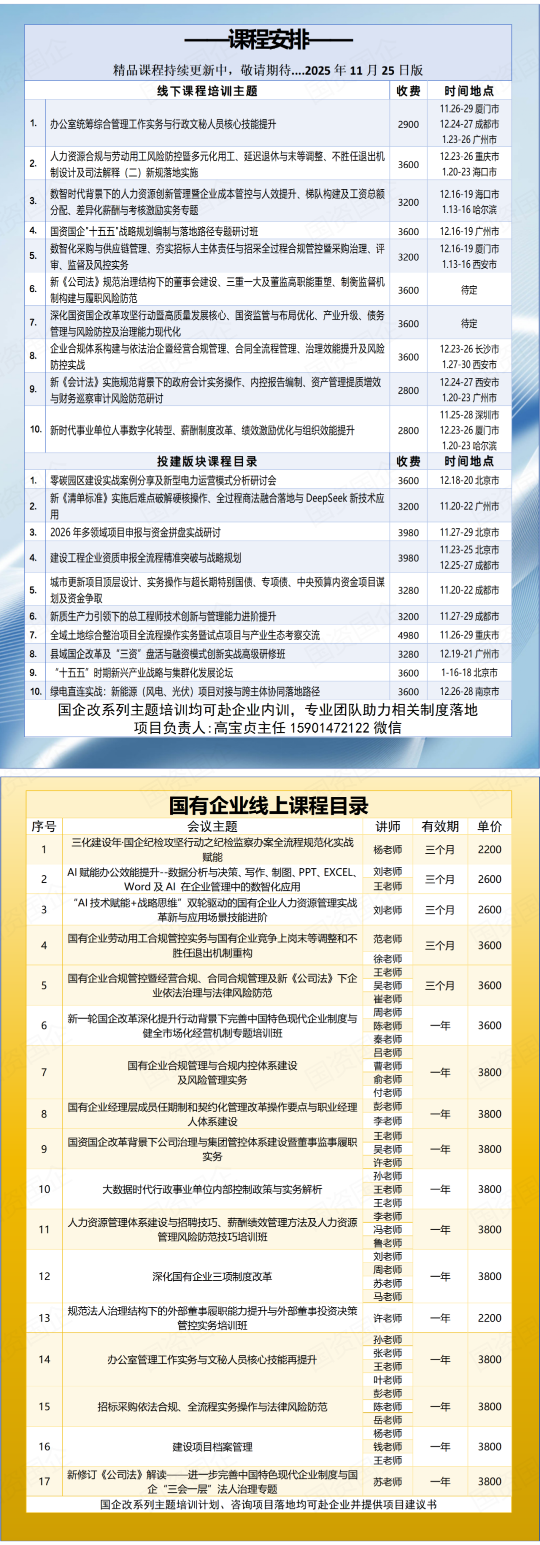 2.本次培训内容及国企改革相关培训内容均可赴企业提供内训;
