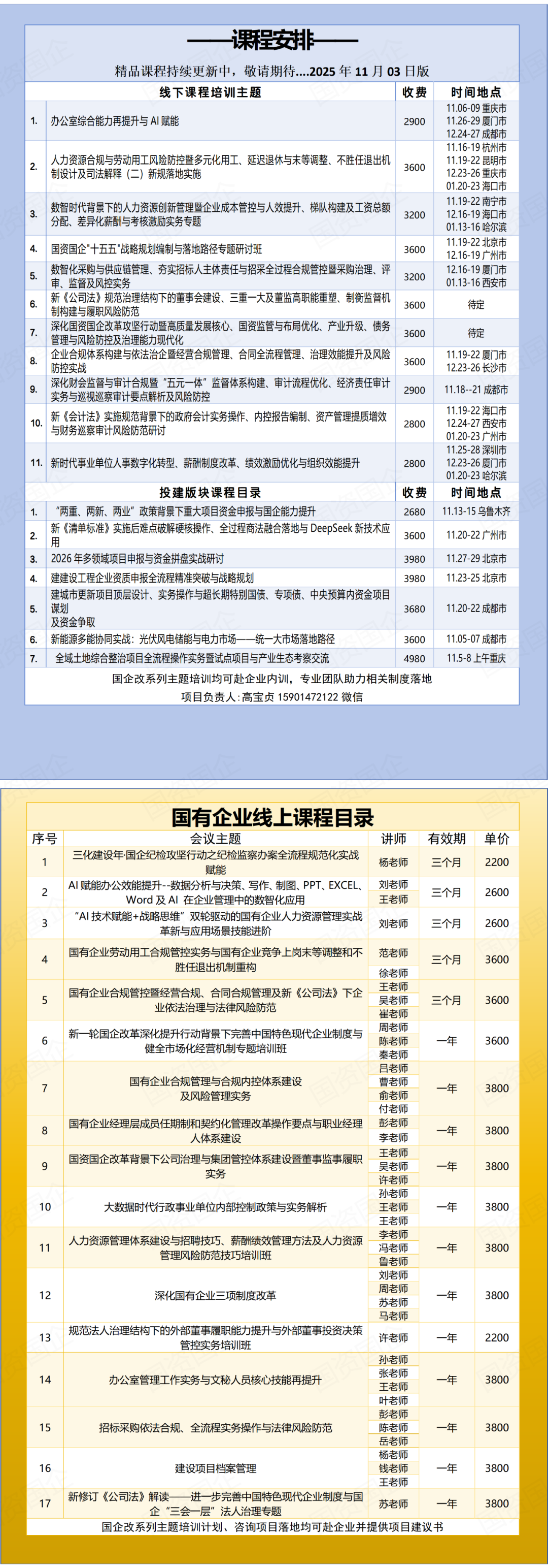 2.本次培训内容及国企改革相关培训内容均可赴企业提供内训;