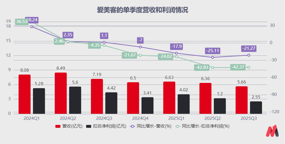 财报显示,在2024年第4季度出现单季度营收、利润下滑后,2025年前三个季度爱美客也没能改变业绩下降趋势,季度业绩双降持续。具体为: