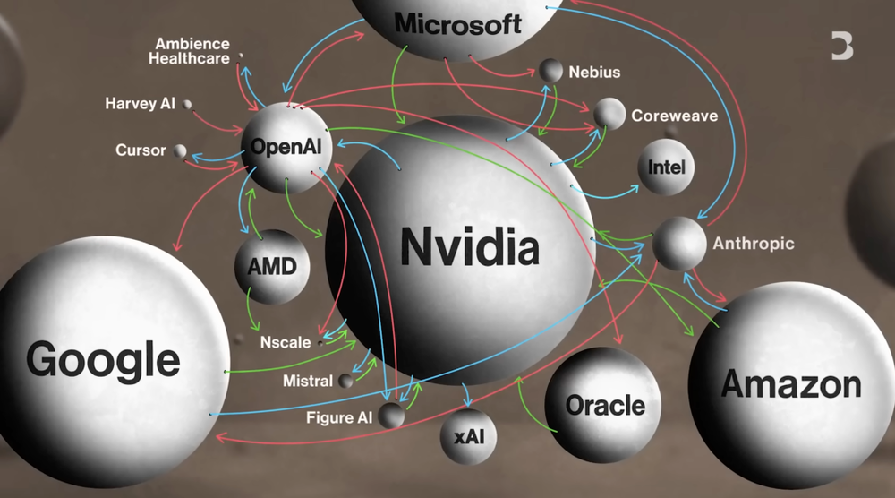 OpenAI 在过去一年里与英伟达、甲骨文、微软、AMD、CoreWeave、Google 等公司,达成了极其复杂的连锁交易。在这些交易当中,OpenAI 或许能够获得一些周转资金,或是基础设施费用的减免。