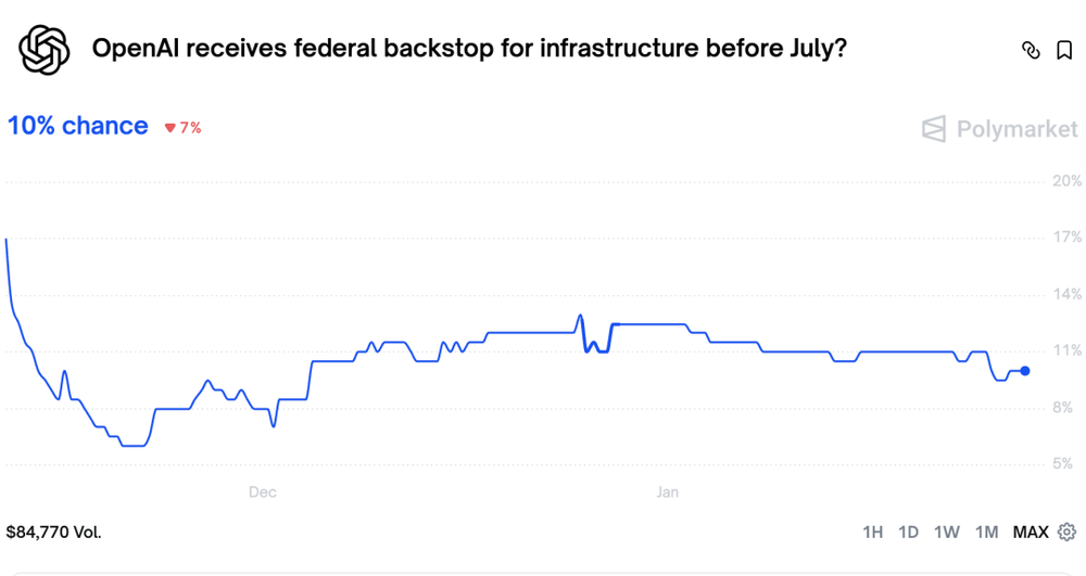 有人在为 OpenAI 上市时的市值下注,估值各不相同;也有人在赌政府是否会在今年 7 月之前出手救助 OpenAI;还有人押注 OpenAI 会在 2027 年前被其他公司收购。