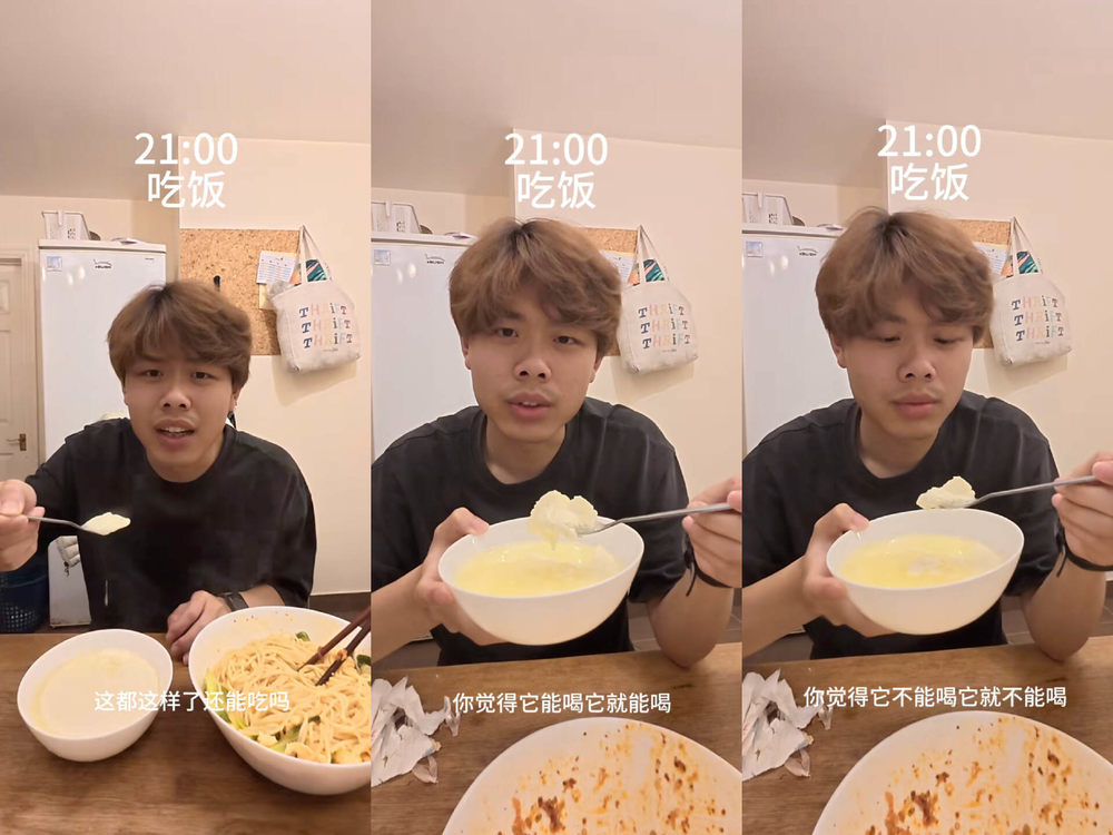 在他的食谱中,过期食物占比极高。有且不限于:吃到底下发现坏了的豆豆子,过期一个月的面包,开封三四天的罐头,发酸的馒头、疑似发酵出酒精的蔬菜沙拉,过期的沙拉酱,在冷冻层永生的冰淇淋等。