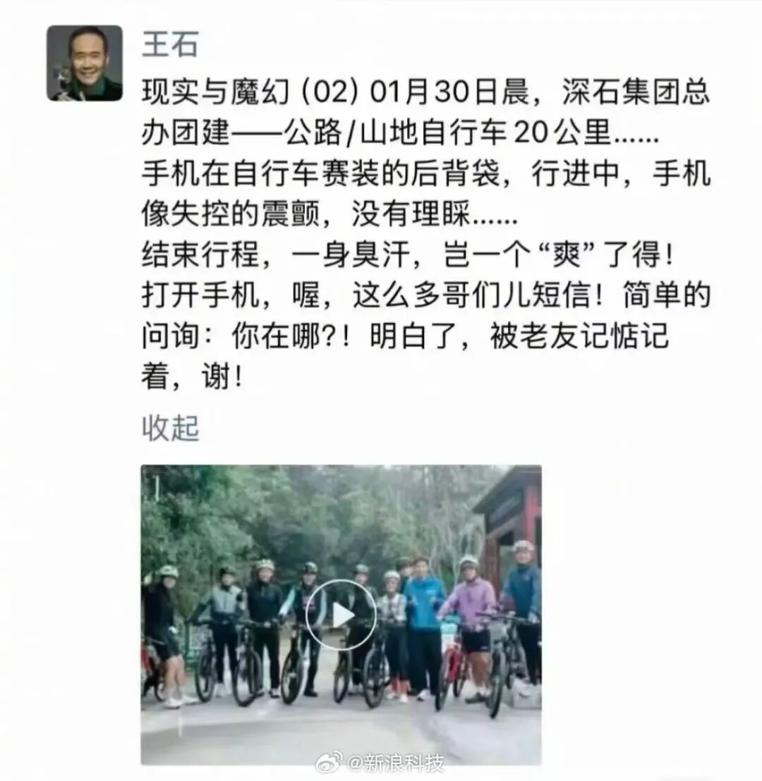 王石在发布的骑行视频中专门标注了时间为1月30日,当日他在深圳马峦山骑行14.44公里,历时两个小时。他还发布朋友圈:“现实与魔幻(02)01月30日晨,深石集团总办团建——公路/山地自行车20公里⋯⋯手机在自行车赛装的后背袋,行进中,手机像失控的震颤,没有理睬⋯⋯结束行程,一身臭汗,岂一个‘爽’了得!打开手机,喔,这么多哥们儿短信!简单的问询:你在哪?!明白了,被老友记惦记着,谢!”