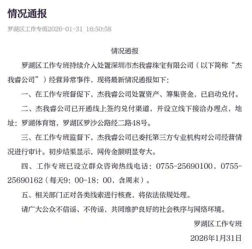 据每日经济新闻,1月31日,深圳罗湖区工作专班发布情况通报称,杰我睿公司处置资产、筹集资金,已启动兑付,目前已经开通线上签约兑付渠道,并于罗湖体育馆设立线下接洽办理点。