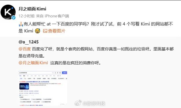 2月1日上午,月之暗面Kimi于微博发文求助称:“有人能帮忙 at 一下百度的同学吗?刚才试了试,前 4 个写着 Kimi 的网站都不是 Kimi。”据其配图内容,于百度搜索“Kimi官网”,最先展示的几条检索链接均为百度推荐的广告内容,并非kimi官方网站。