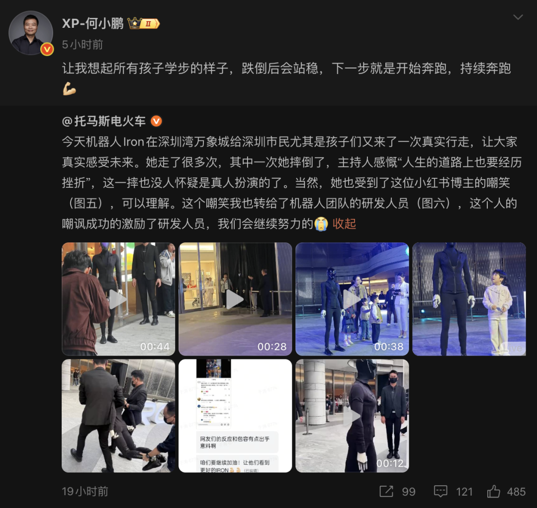 有网友在社交平台晒出小鹏 IRON 人形机器人摔倒照片,对此,小鹏汽车董事长何小鹏和小鹏汽车副总裁均进行了回应。