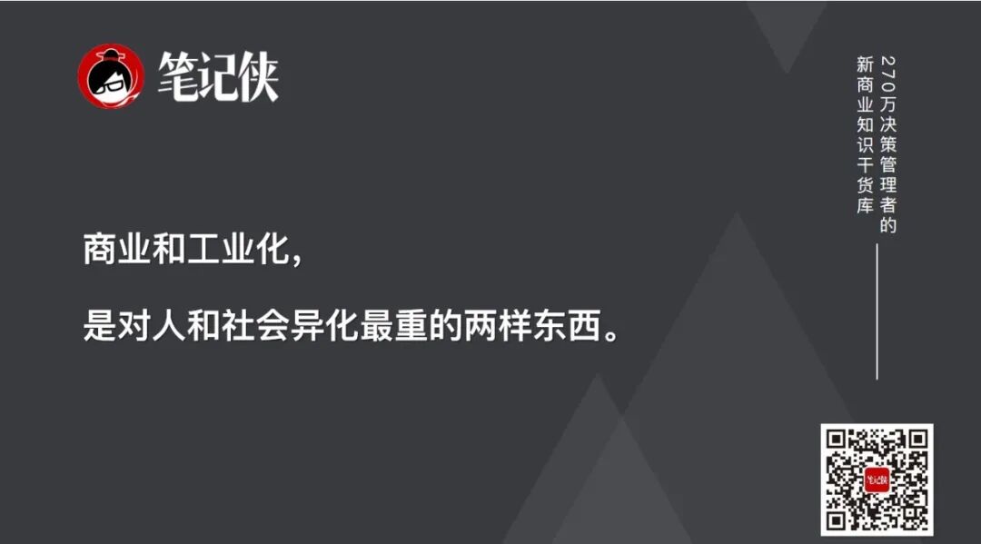 其实大家可以发现一个有趣的现象,商业和工业化,是对人和社会异化最重的两样东西。效率的正义、标准化的正义,本质是因为过去的世界太匮乏了,我们需要快速协同,生产标准化的东西,像罐头一样投喂给每个人,先解决温饱问题。