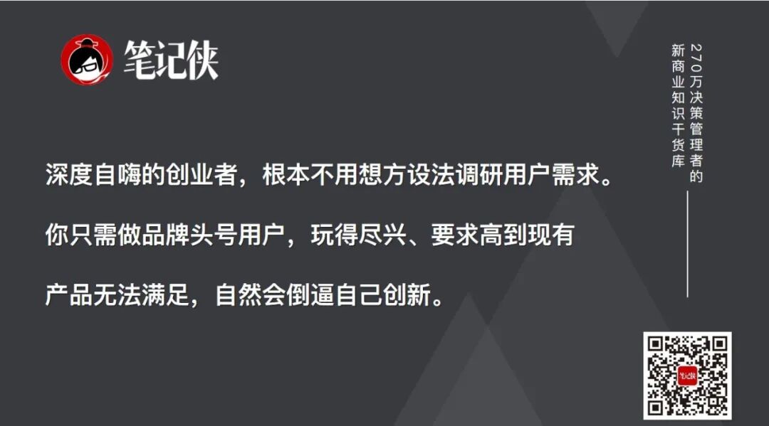 这背后的逻辑很简单:作为深度自嗨的创业者,你根本不用想方设法去跟用户沟通、问用户需要什么,因为绝大部分用户自己也不知道自己的真实需求是什么。你只需要把自己变成品牌的头号用户,自己玩得够嗨、要求够高,高到市面上现有的产品和服务都满足不了你,那你就必须去创新。