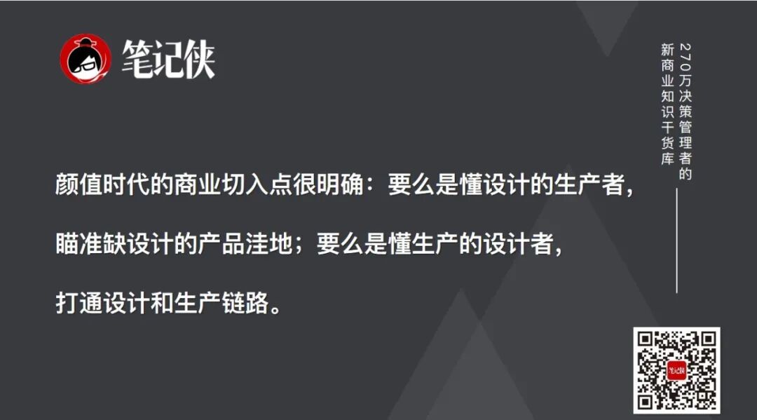 颜值时代的到来,其实有个比较好的商业切入点:要么你是生产者中最懂设计的,瞄准那些原本缺乏设计的产品洼地;要么你是设计者中最懂生产的,打通设计和生产的链路。