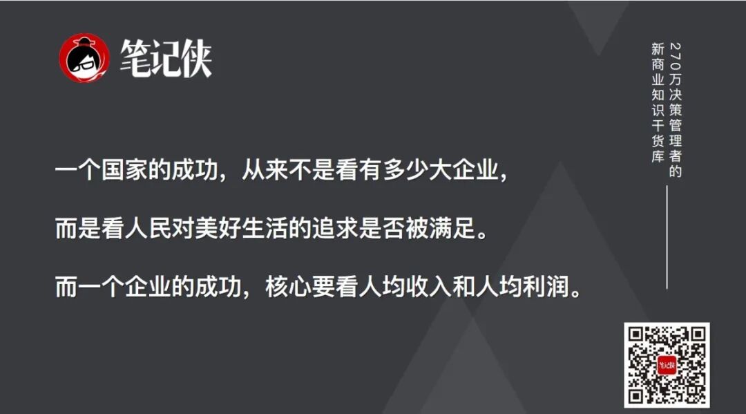 还有一个核心问题:什么是成功?我认为,一个国家的成功,从来不是看有多少大企业,而是看人民对美好生活的追求是否被满足。而一个企业的成功,评判标准也应该变一变,核心要看人均收入和人均利润。