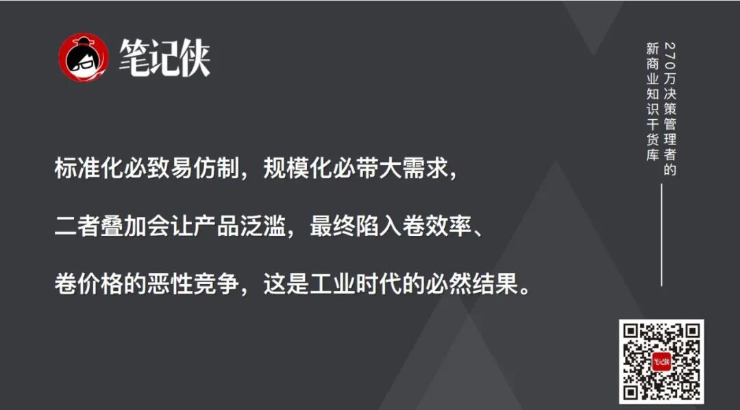 但大家可以想一下,任何东西一旦标准化,就意味着极易被仿制;一旦规模化,就代表有大规模的市场需求,而“有规模需求+极易被仿制”,必然会导致产品泛滥,最后一定会进入卷效率、卷价格的恶性竞争状态,相互压榨,这是工业时代绕不开的结果。