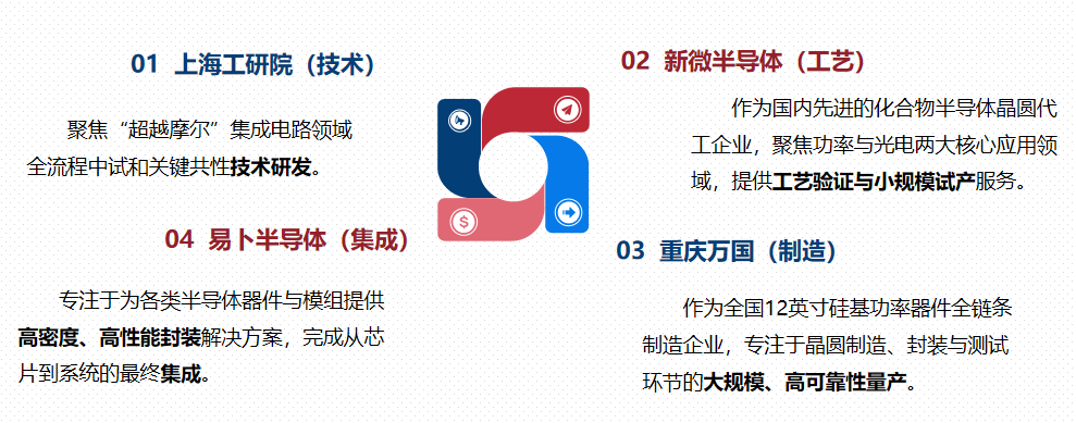 以上海工研院的原创技术与IP为起点,可在新微半导体完成化合物工艺验证,在重庆万国实现硅基功率器件的大规模稳定流片,最终由易卜半导体进行系统级先进封装与集成。