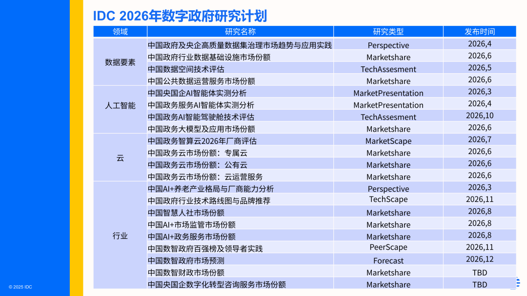 IDC 认为,数智政府将成为未来一个五年乃至更长周期内中国政府数字化建设的主线,深刻影响公共服务供给方式、城市运行治理模式、数据要素价值释放路径以及数字技术的社会价值实现。在“十五五”全面展开之际,数智政府的规模化建设成效,将成为衡量治理现代化水平的重要维度,也将重塑政府数字化市场的竞争格局与产业机会。