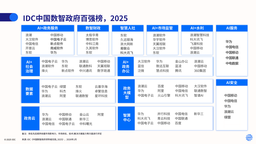 基于市场规模、技术成熟度、实践效果与可复制性等多维评估,IDC 发布了 “2025年中国数智政府百强榜”,提炼可复制的领先实践与产业共识,集中体现五大趋势: