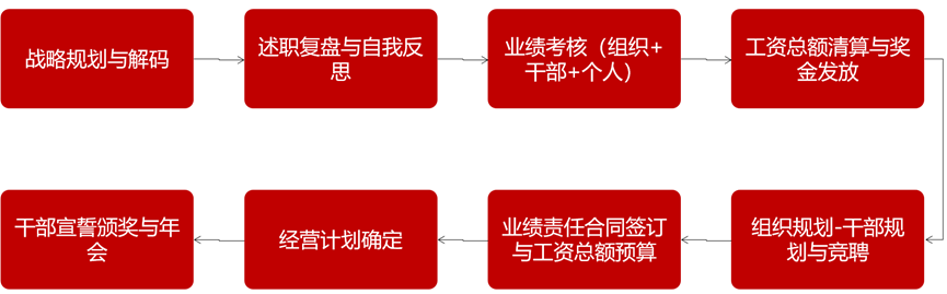 考核结束后,便进入工资总额的清算与奖金发放阶段。奖金发放完毕,就开始着手下一年度的规划工作,其中包括组织规划、干部规划以及竞聘工作。竞聘成功后,相关人员需签订业绩责任合同,而年终考核的依据正是这份年初签订的业绩责任合同。在完成战略规划、战略解码后,部门的重点工作和工作计划已基本确定,竞聘上岗人员需带领团队对部门经营计划进行进一步细化和完善。此外,年底还会开展干部宣誓、颁奖以及年会等活动。