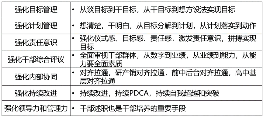 反思的目标还包括增强组织活力、打造一支铁军、推动员工成长等。具体来说,就是要倾听客户需求,正视公司存在的问题与不足,关注学习同行优点,优化组织机体,持续推进管理进步,以适应快速多变、竞争激烈的市场环境;构建一支高素质、高境界、高度团结、长期拼搏的干部队伍;保持员工反思的能力,避免员工出现傲慢、狂妄、自大与自恋的心态,推动员工不断自我反省、自我激励。