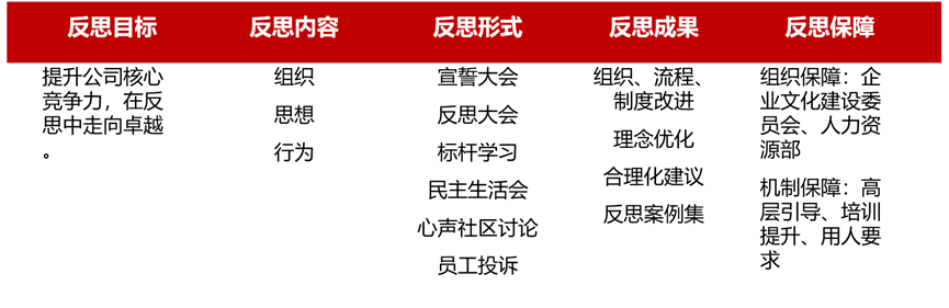 华为的自我反思有明确的目标,即提升公司的核心竞争力,在反思中走向卓越。反思的内容包括组织反思、思想反思和行为反思。反思的形式多种多样,有宣誓大会、反思大会、标杆学习、民主生活会、心声社区讨论、员工投诉等。反思的成果体现在组织流程制度的改进和优化、理念的优化、合理化建议的提出以及反思案例集的编制等方面。反思的保障措施包括组织保障和机制保障,组织保障由企业文化建设委员会和人力资源部负责,机制保障则包括高层引导、培训提升和用人要求等。