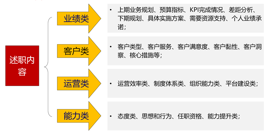 述职内容涵盖业绩类、客户类、运营类、能力类等方面。