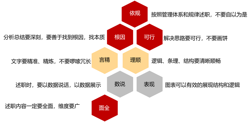 优秀的述职报告应符合“面全、数说、表现、言精、理顺、根因、可行、依规”这八个关键词。