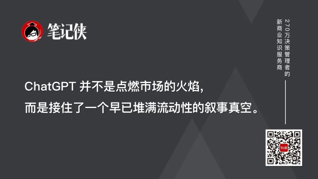 这个故事,凑巧就发生在2022年四季度,ChatGPT3.5横空出世。这个技术进步发生的时间节点,恰好是市场极度渴望一个“大故事”的时间节点。这个“叙事”,就这样产生了。