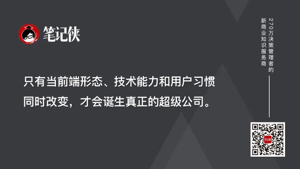 前端(UI)+中端(技术)+终端(设备和用户习惯)同时发生变化,才有诞生超大新创公司的可能性。