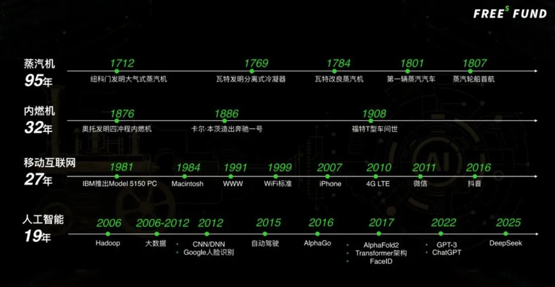 蒸汽机从1712年诞生,到蒸汽汽车、蒸汽轮船真正落地,用了95年;互联网从1981年个人电脑出现,到iPhone和微信成为国民级应用,也用了约30年。