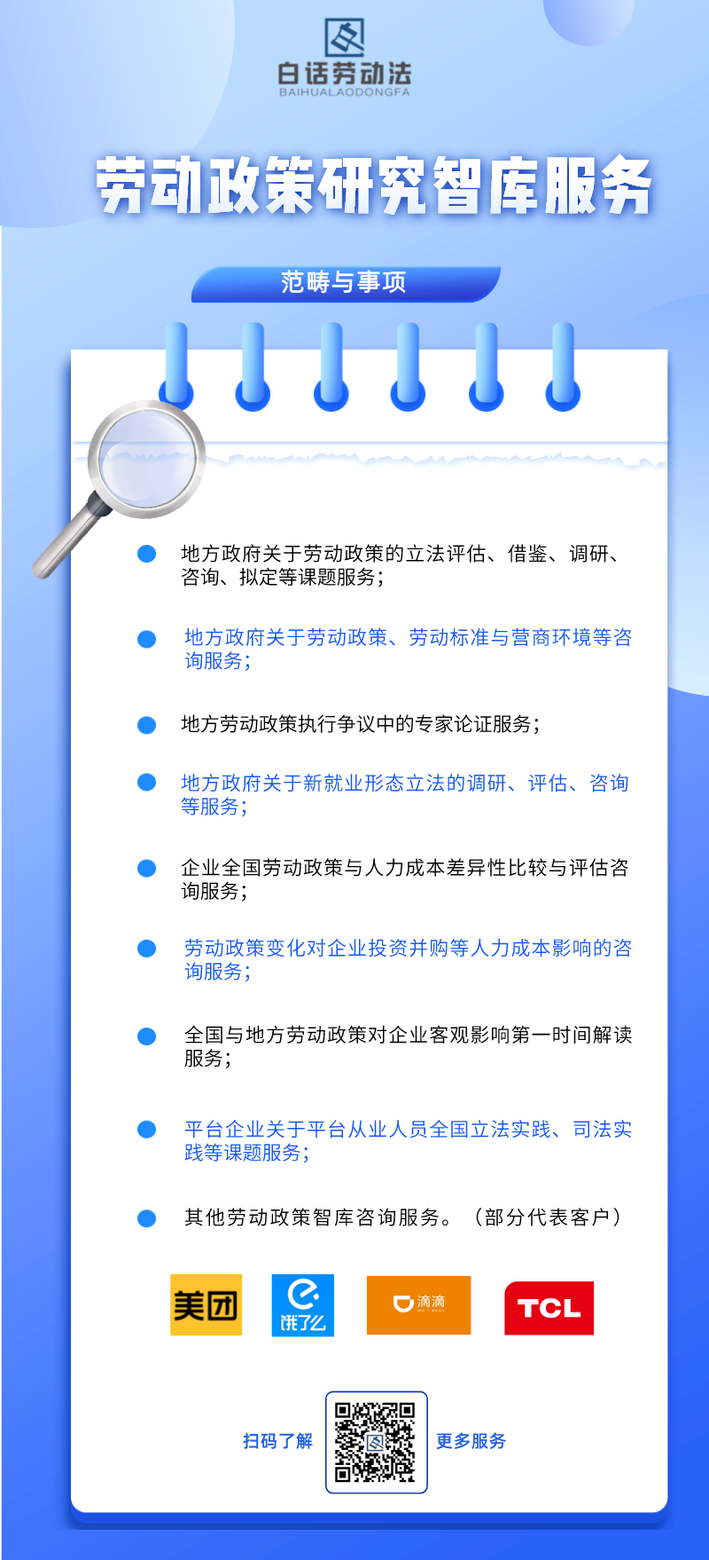 【白话劳动法】基于其与中国人事科学研究院、中国劳动科学研究院、中国社会科学研究院等国内顶级研究机构的战略合作,以及与清华大学、北京大学、人民大学等国内一流高校的项目合作,并基于其团队成员丰富的劳动政策研究与实践,特针对地方政府、人社部门、大型企业、互联网企业、平台企业等推出【劳动政策研究智库服务】,欢迎交流沟通。